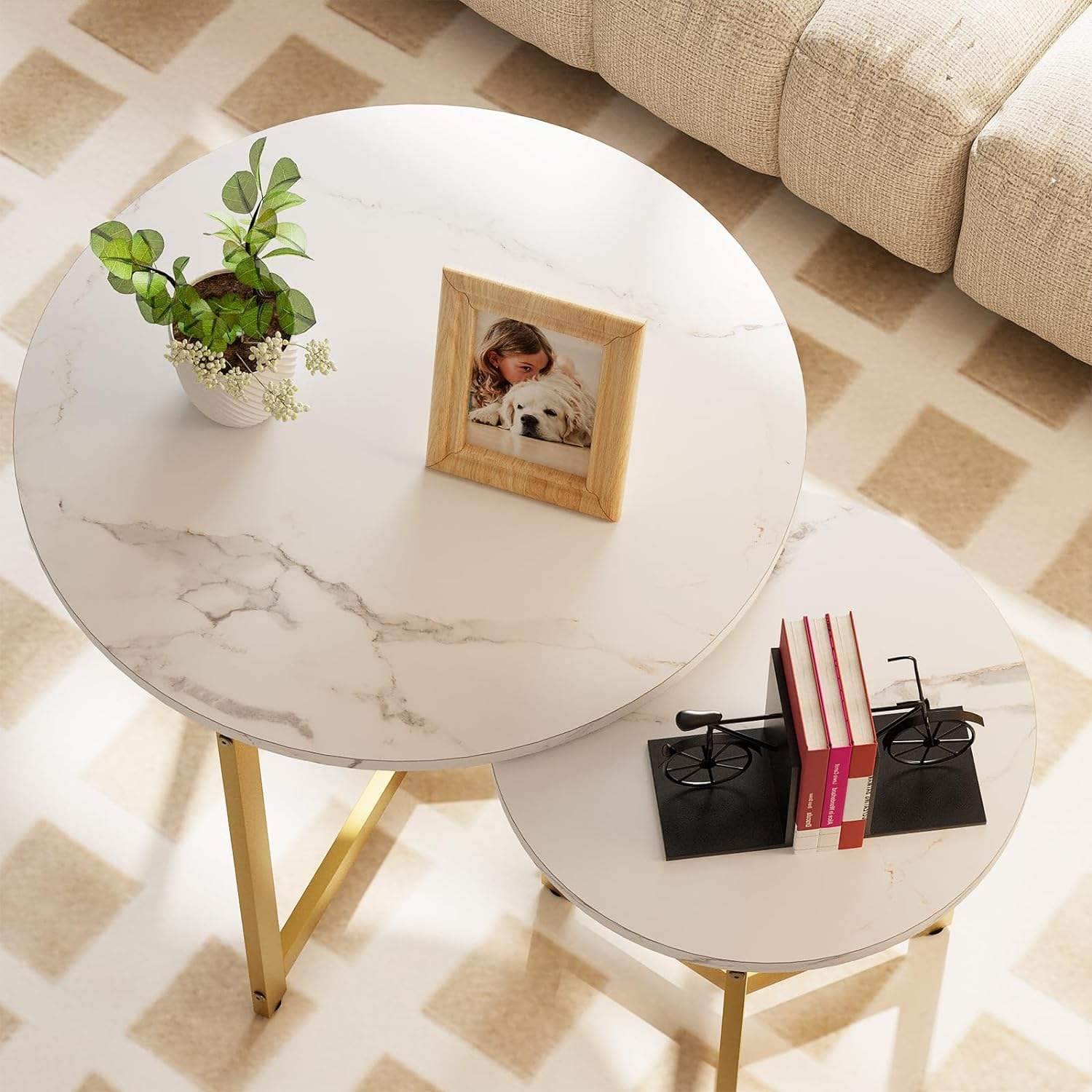 • Luxury Design Nesting Gold Metal Side Glass Marble Mdf Wood Coffee Table Nest of 2 Round Table Set